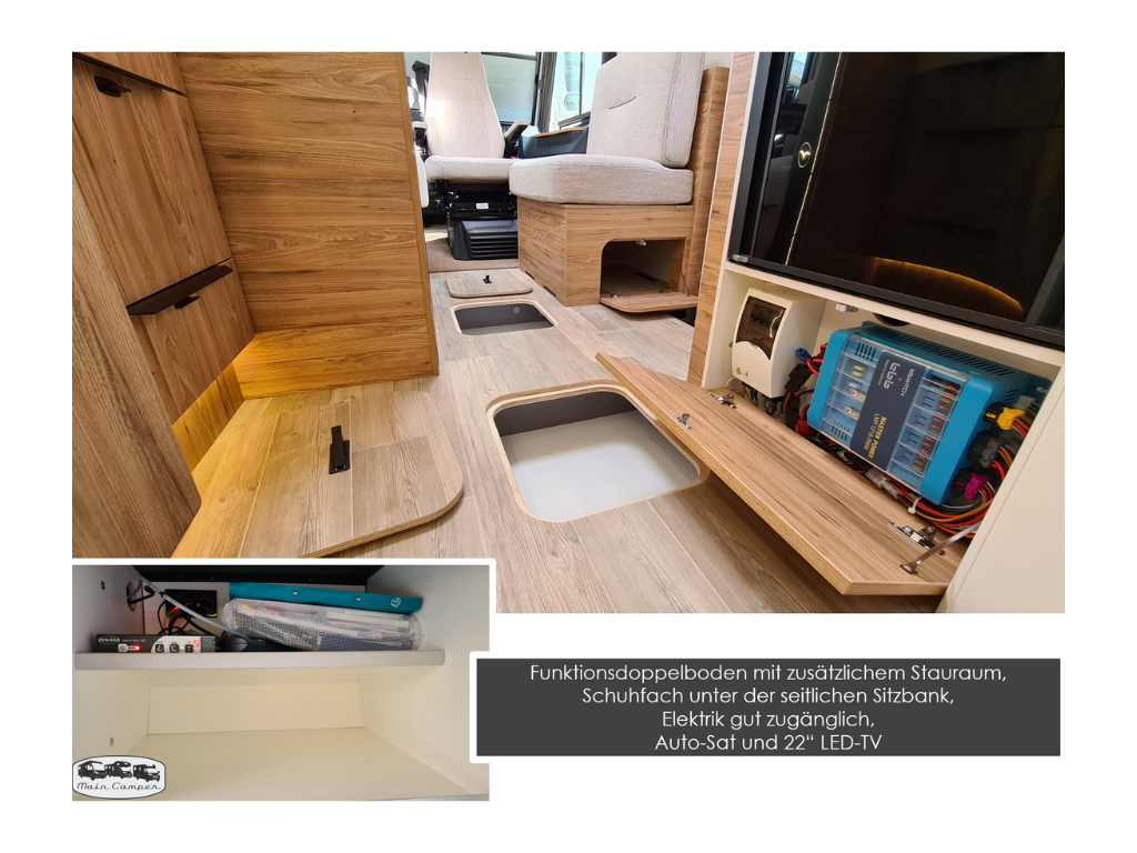 Mit der Wohnraum-Klimaanlage lässt es sich außerdem auch im Hochsommer im Auto bequem aushalten – zum Beispiel vor dem Fernseher mit automatischer Dach-SAT-Anlage.