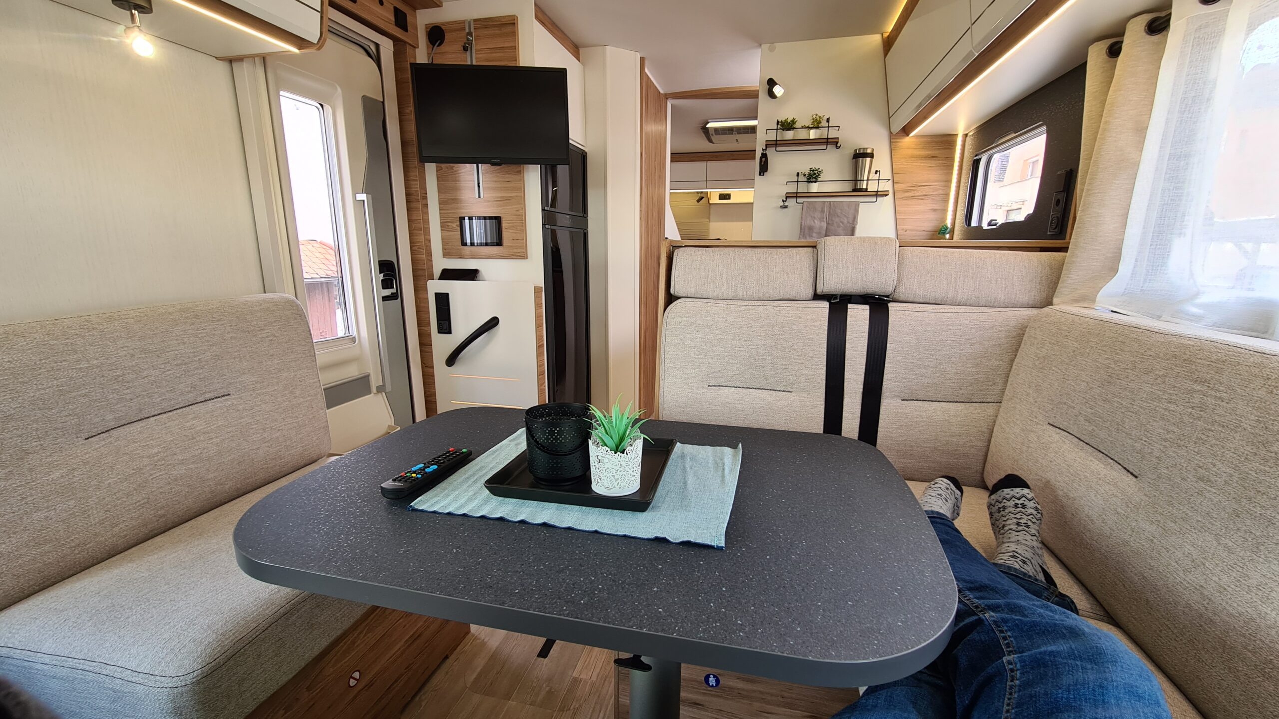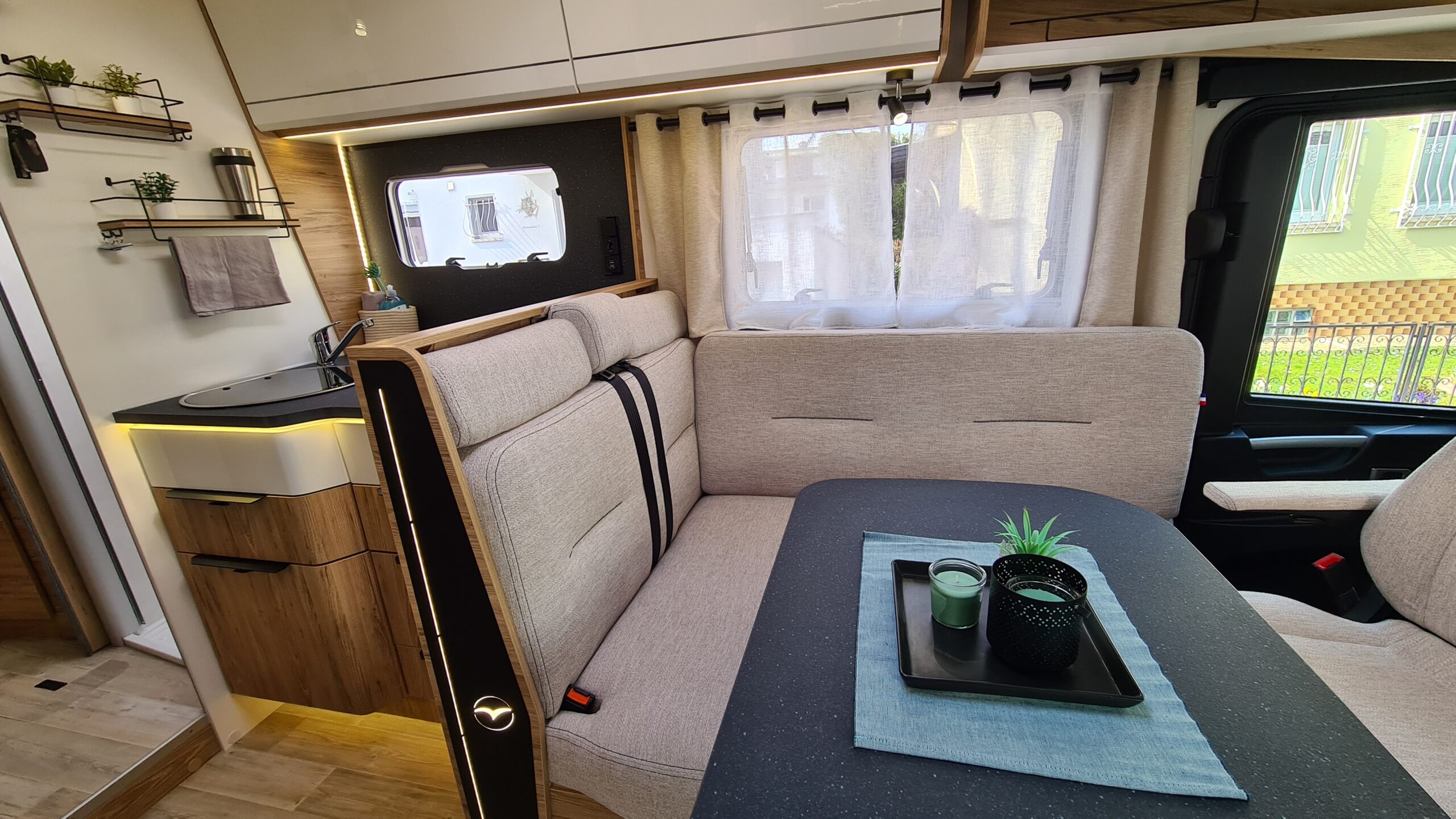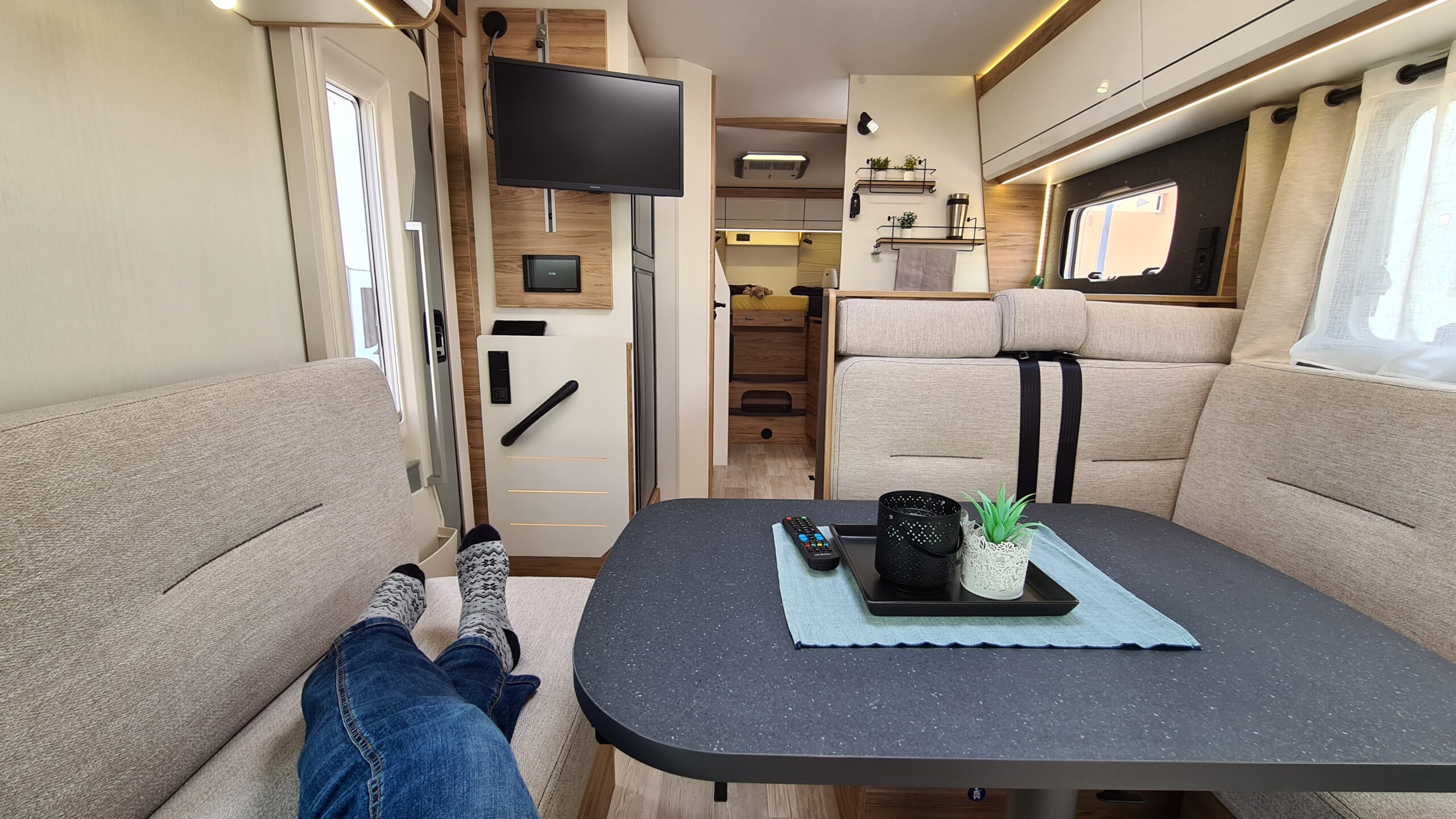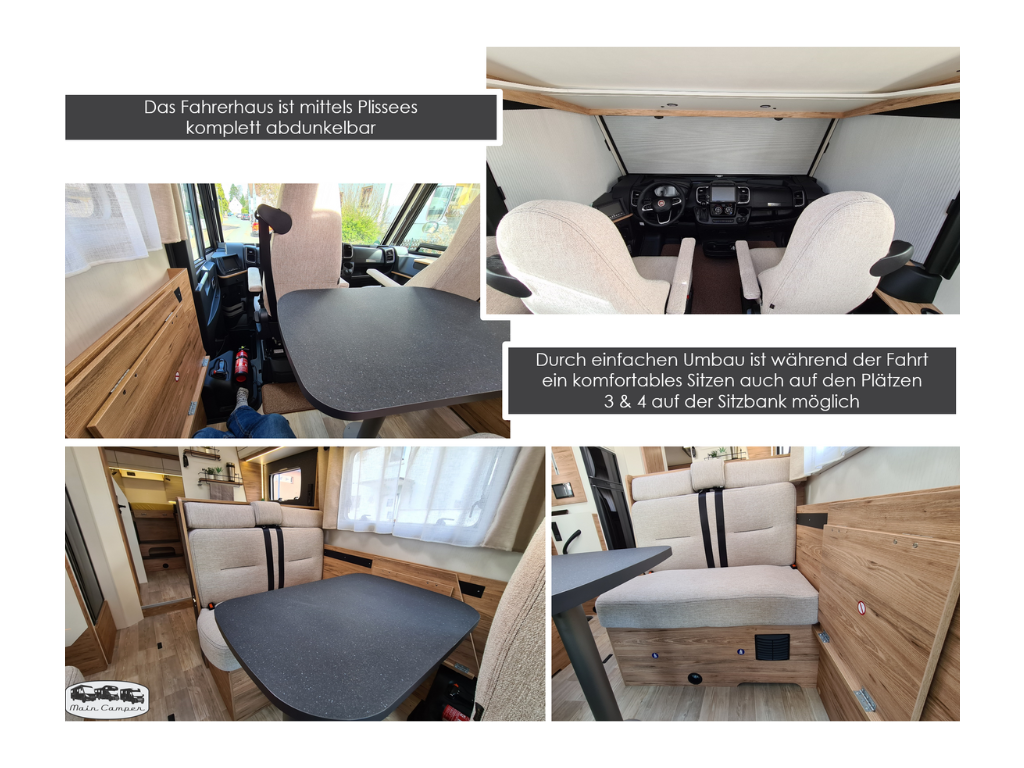 Die großzügigen Sitzgelegenheiten des L-förmigen Wohnbereichs laden zu gemütlichen Stunden ein. Rund um den Klapptisch finden 5 Personen Platz. Die großen Fenster und das Panorama-Hubdach (820 x 520) lassen viel Licht hinein und machen den Aufenthalt im Inneren noch angenehmer.