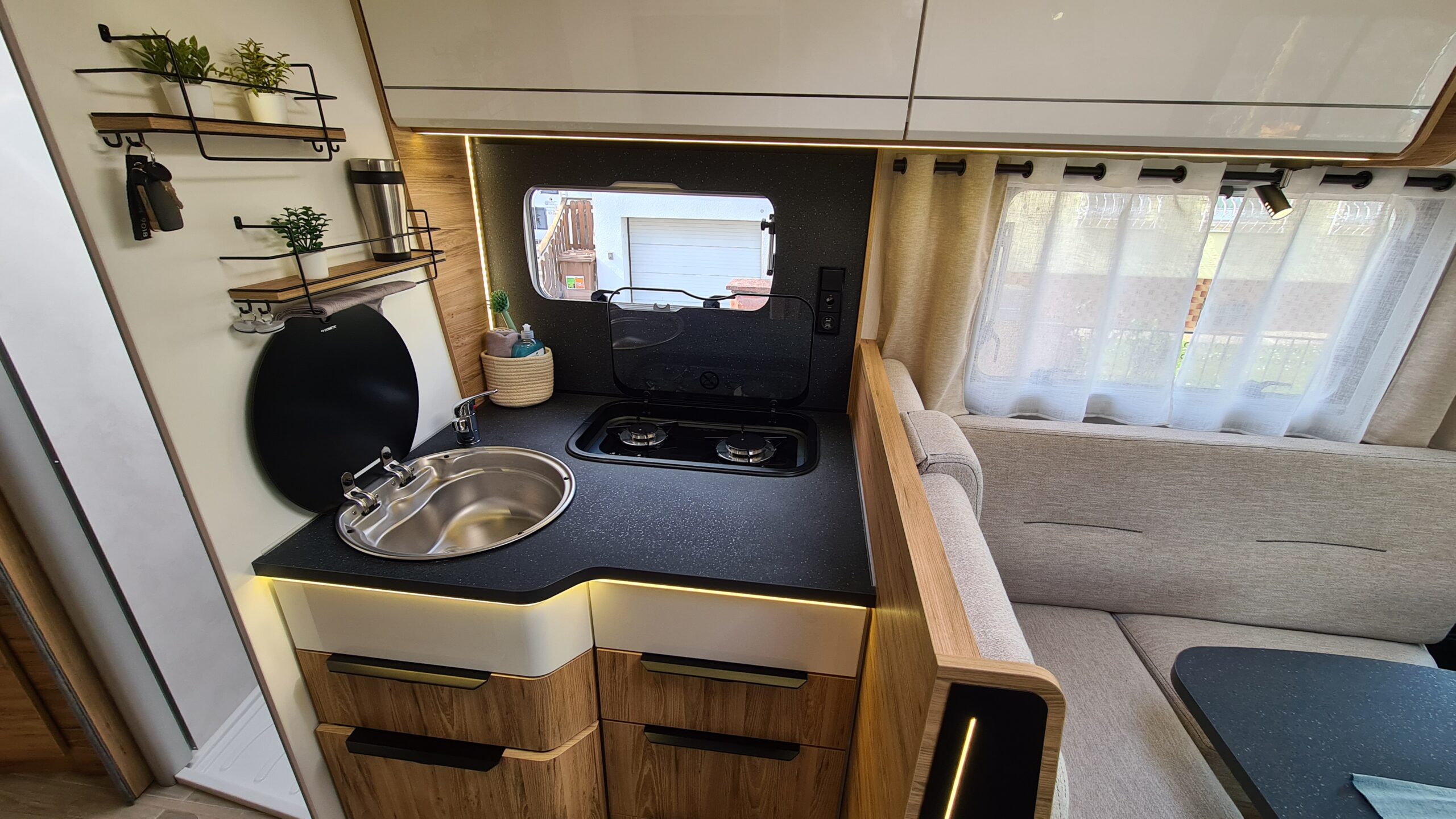 Die vornehme und funktionale Küche verfügt über eine L-förmige Arbeitsfläche, ein 2-Platten-Kochfeld und einen 140-l-Kühlschrank.