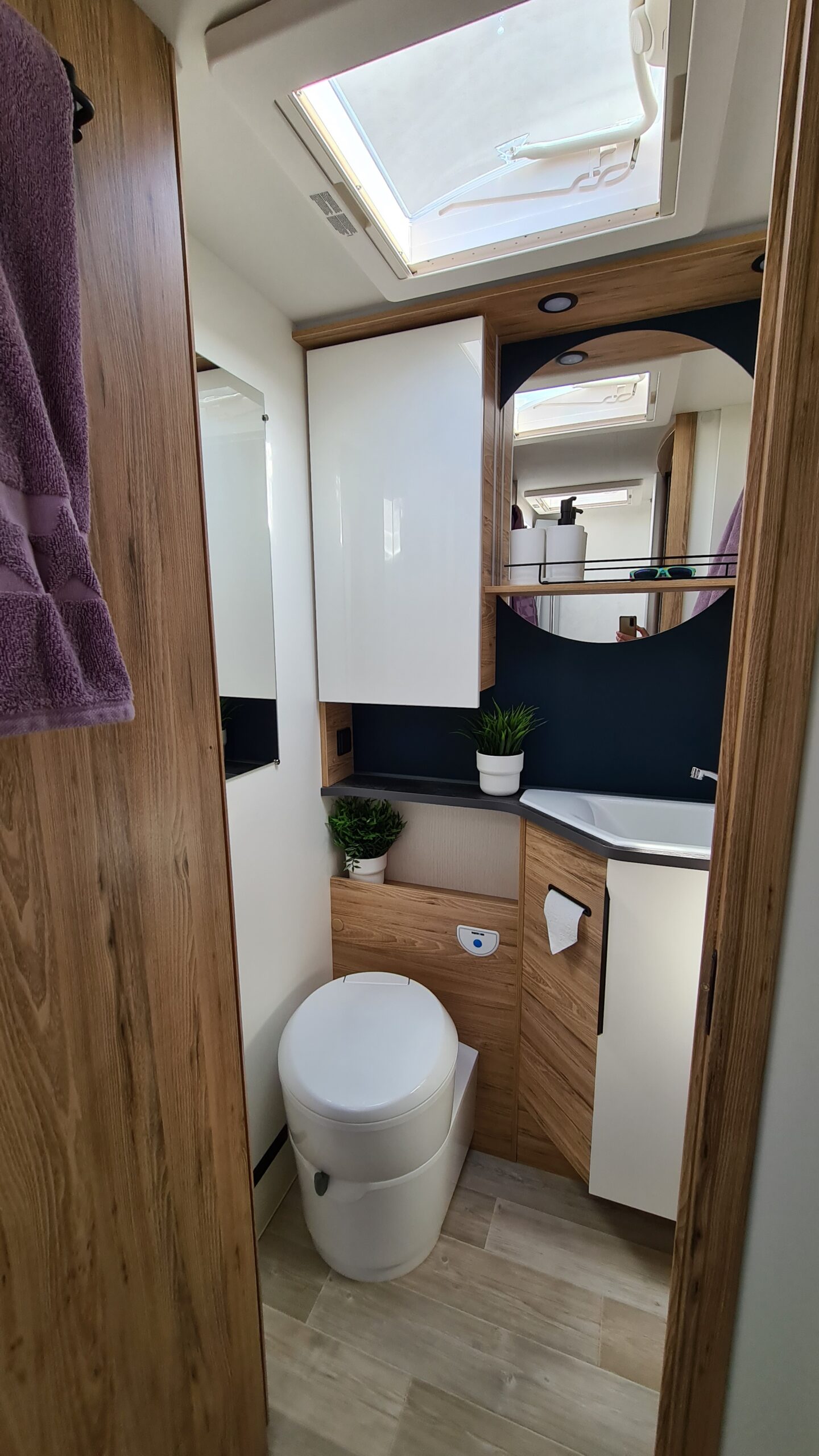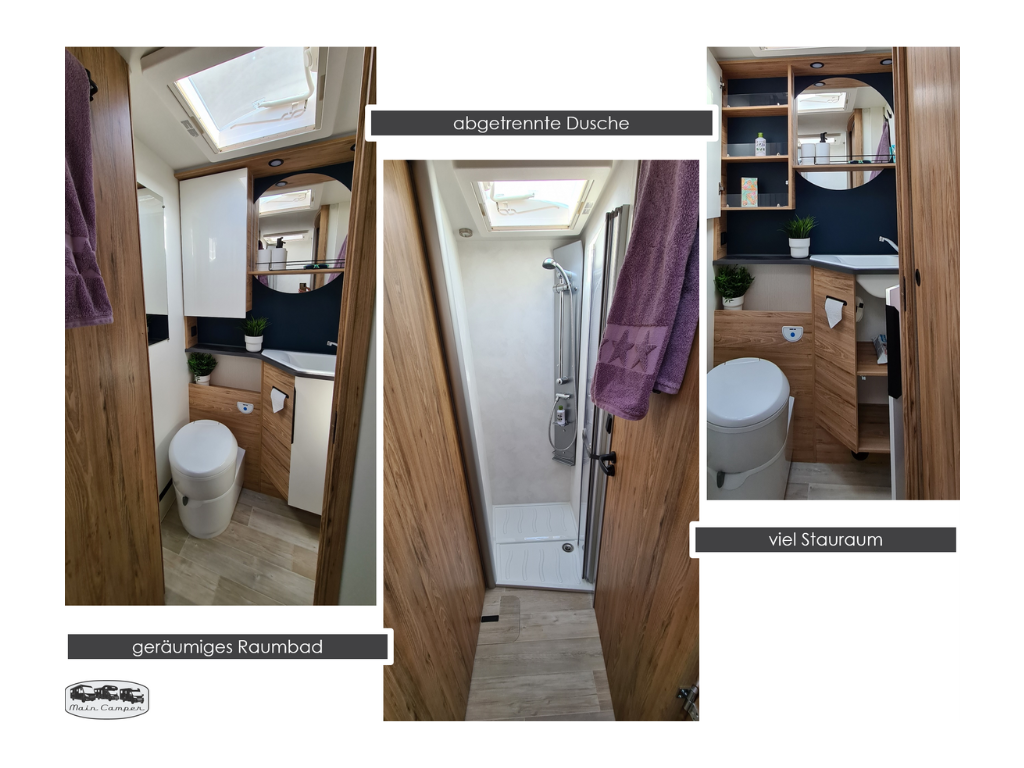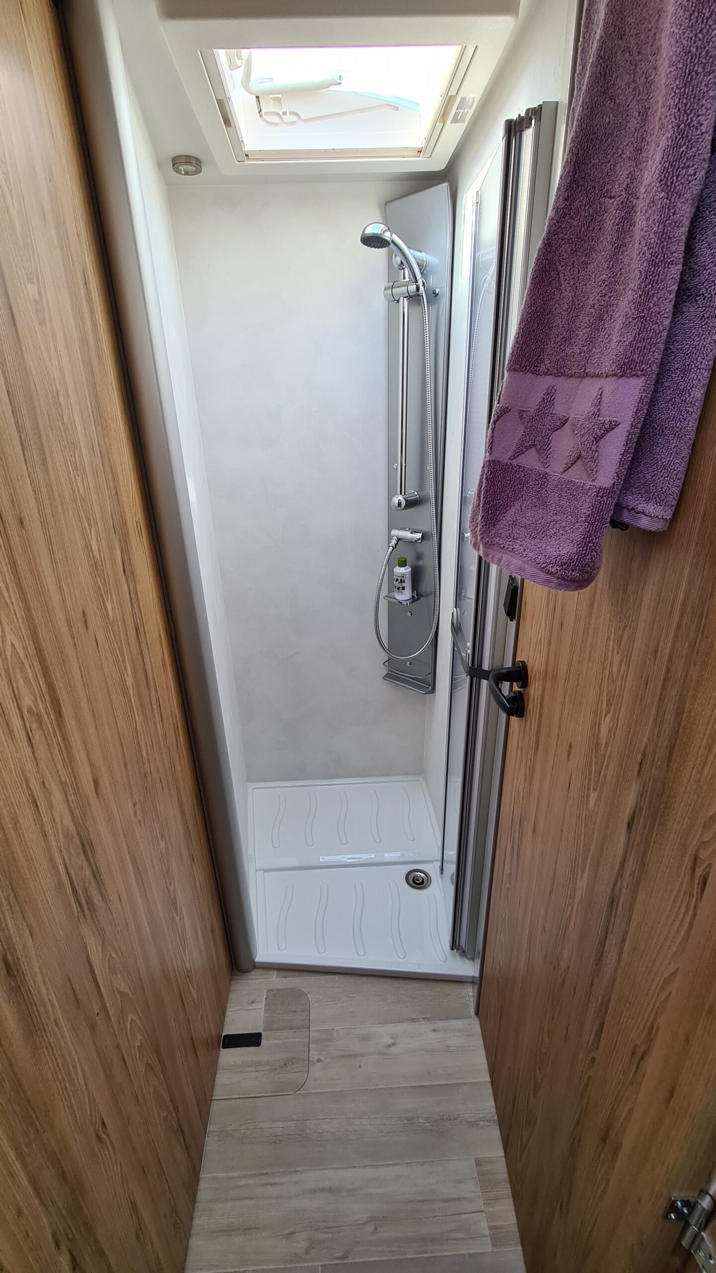 Im G740GJ befindet sich eine komfortable, von der Nasszelle abgetrennte Dusche. Schiebetüren zum Wohn- und Schlafbereich hin sorgen für Privatsphäre und Ungestörtheit.