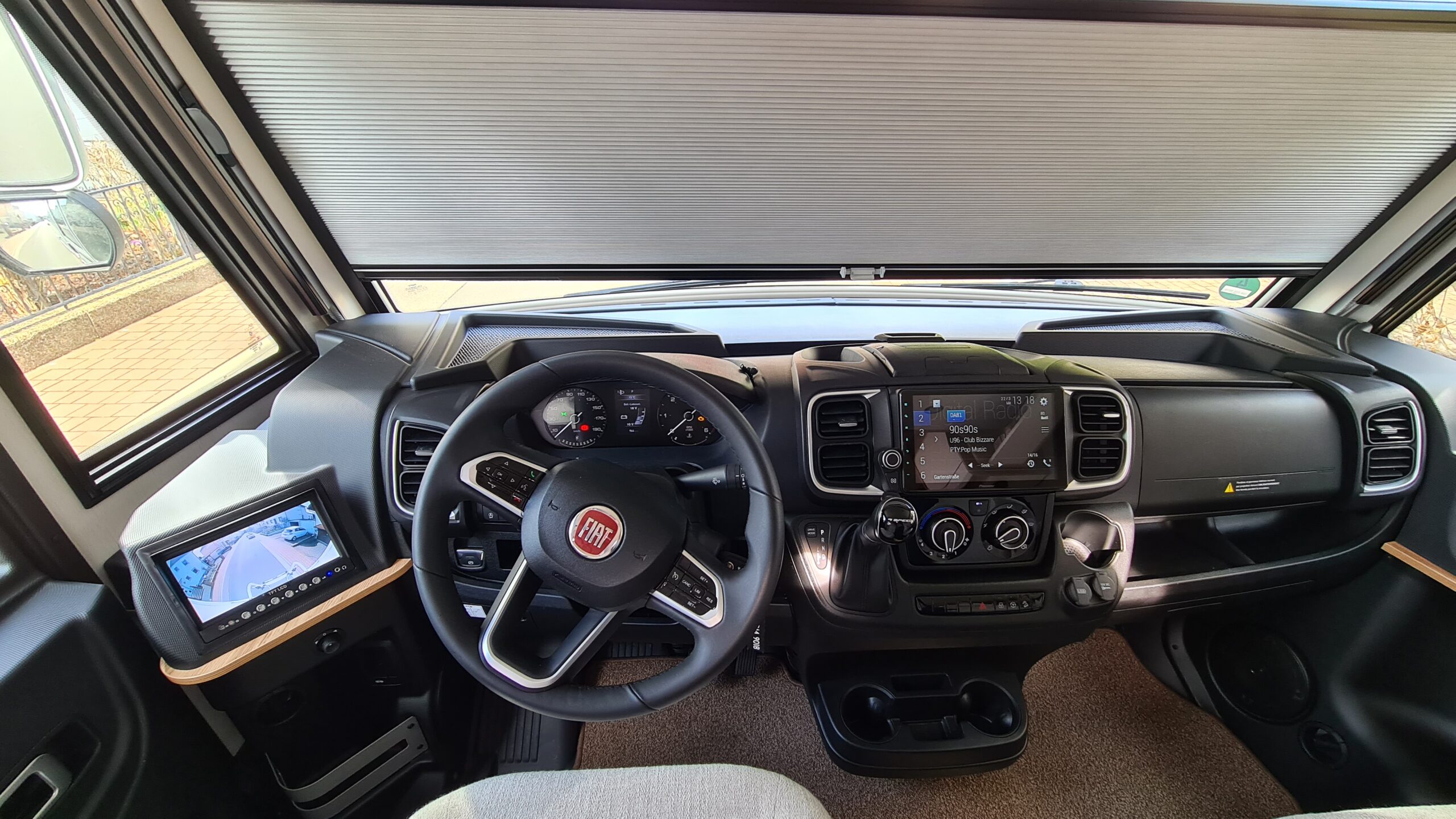 Der auf dem neuen Fahrgestell Fiat Ducato CSS Euro6D basierende G740GJ bringt Sie zu Ihren Traumzielen. Machen Sie es sich in den Sitzen von Aguti bequem und genießen Sie den Fahrkomfort sowie die extrem gute Sicht, die die Vorderseite bietet. Bei einem Halt lässt sich das Fahrerhaus mit Jalousien verdunkeln. Dies garantiert Ruhe und Privatsphäre.