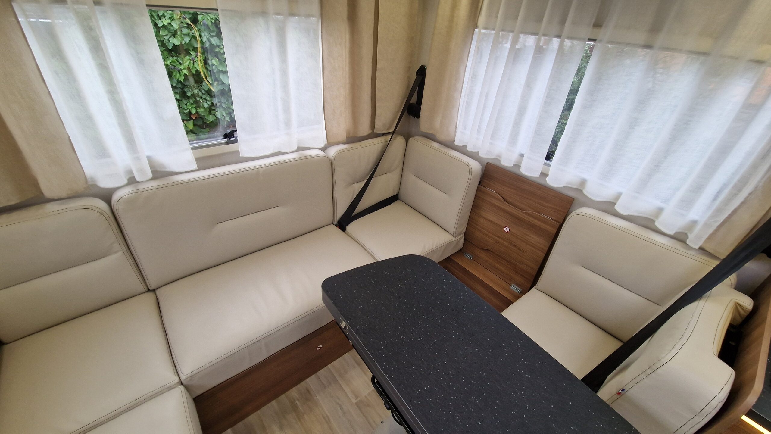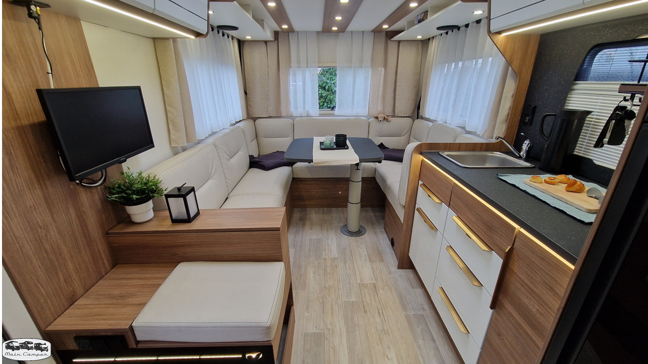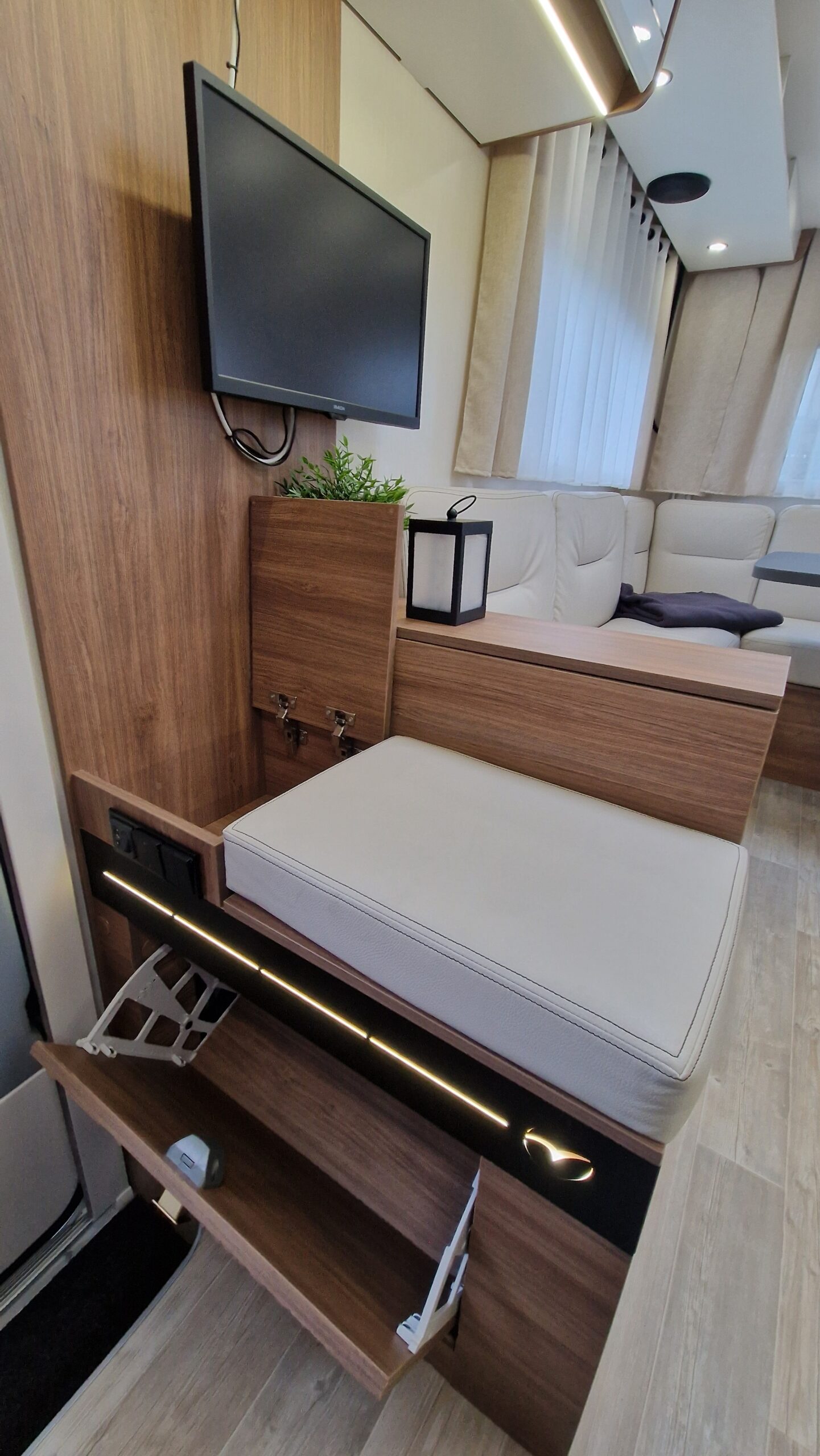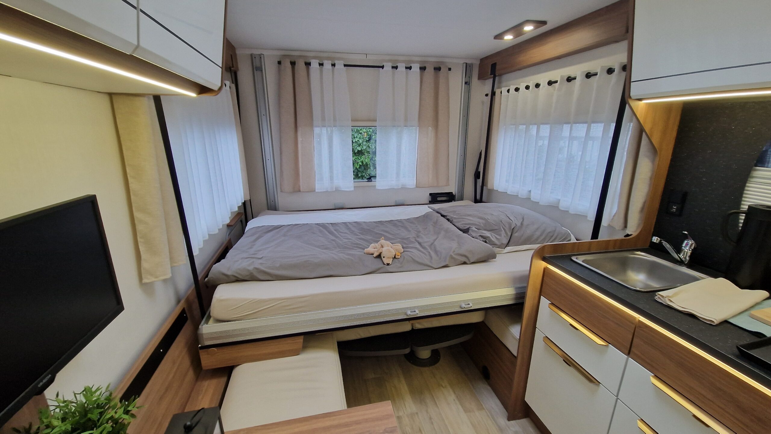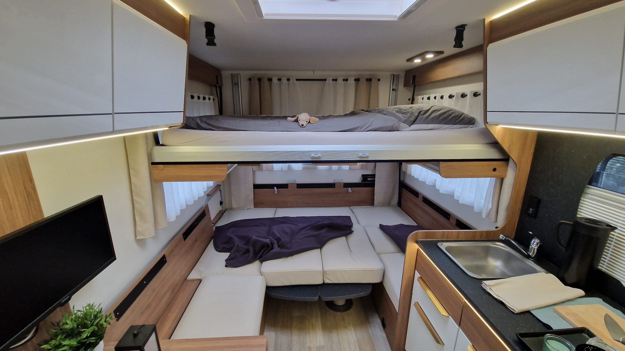 Über der Sitzgruppe befindet sich das große Hubbett, welches Sie entweder ganz herunterlassen können, wodurch ein Einstieg ohne Leiter bequem möglich ist. Falls Sie mit mehr als 2 Personen verreisen, kann selbstverständlich auch die Sitzgruppe zu einem weiteren Doppelbett unter dem Hubbett umgebaut werden.