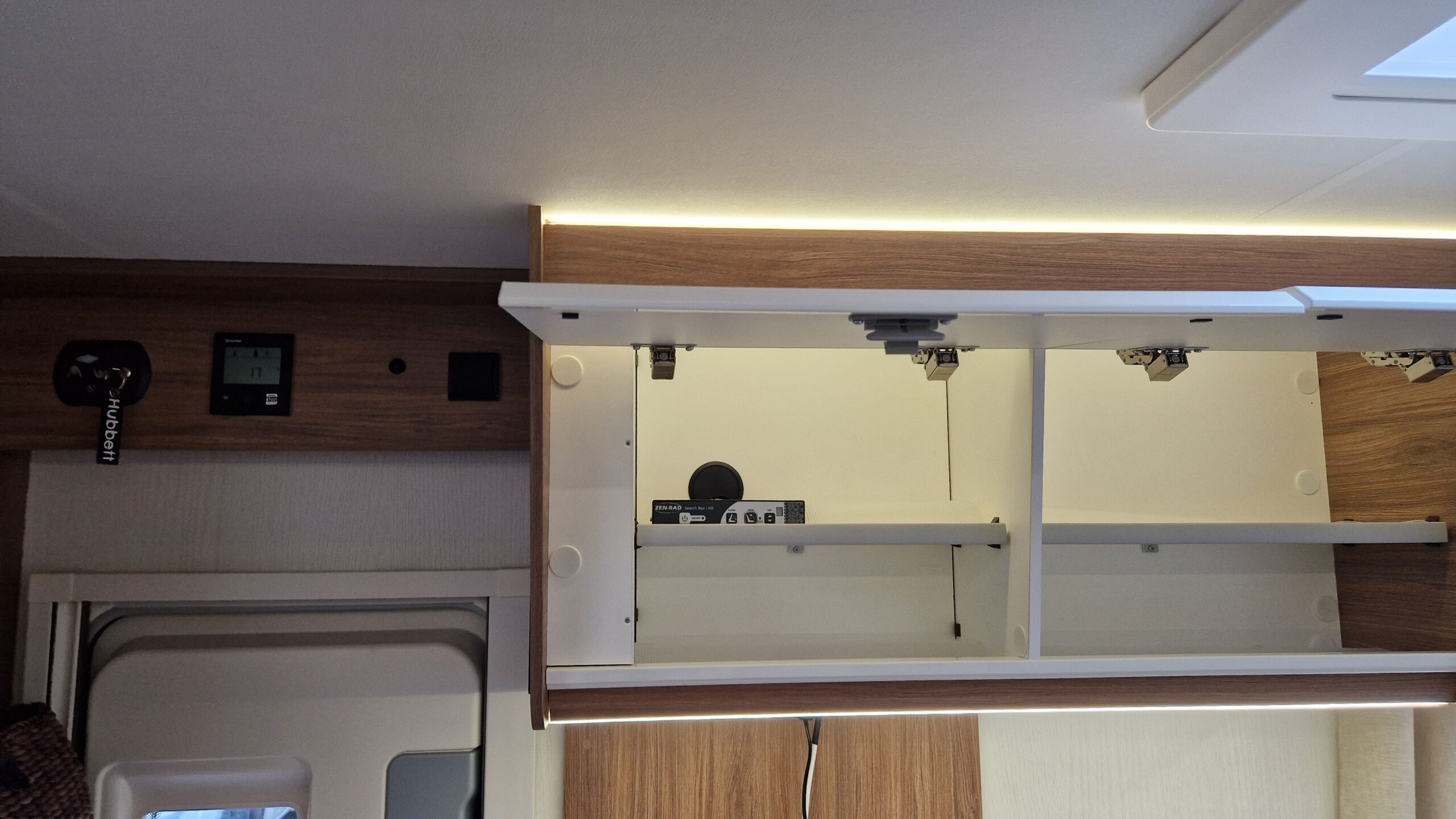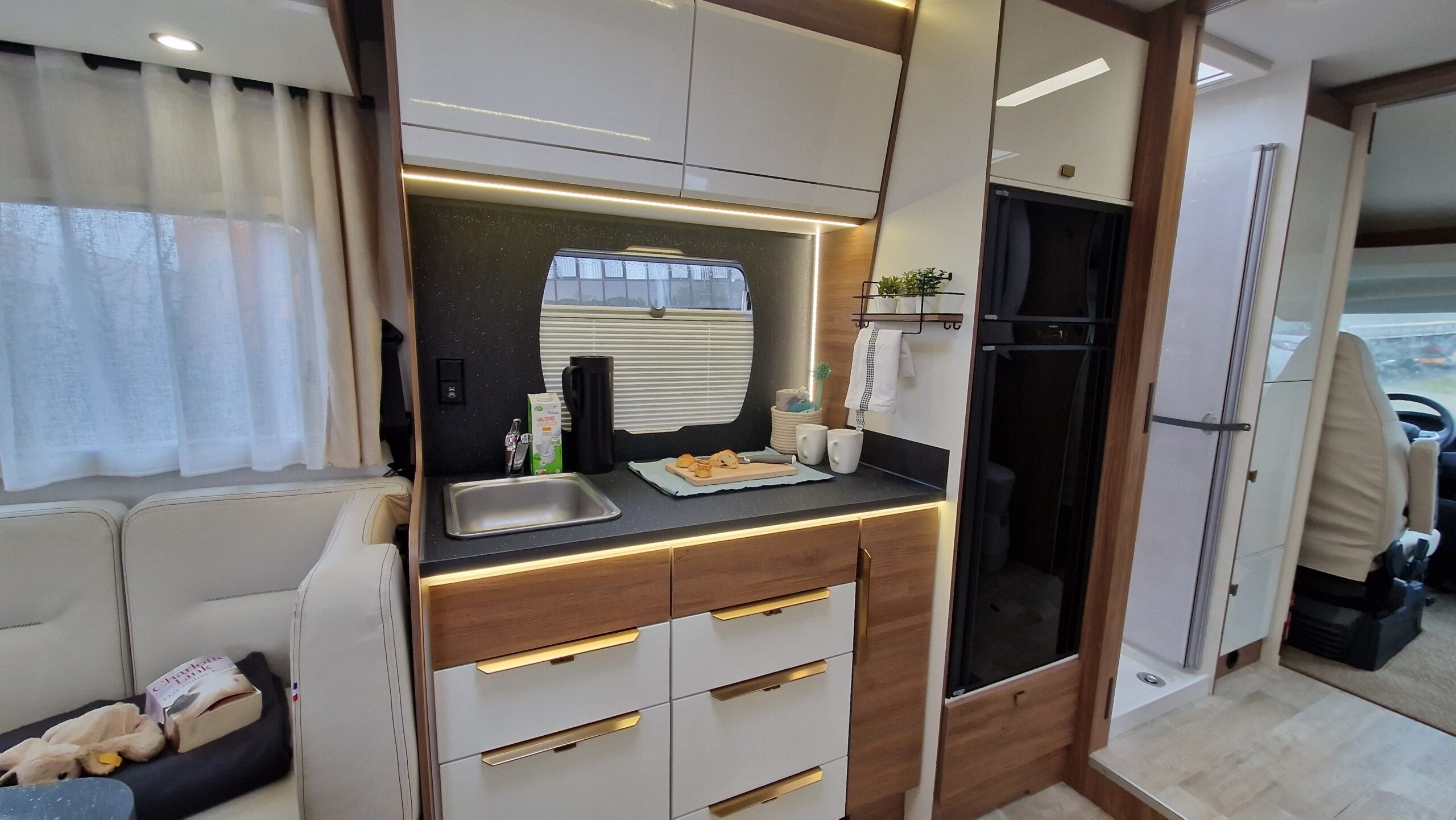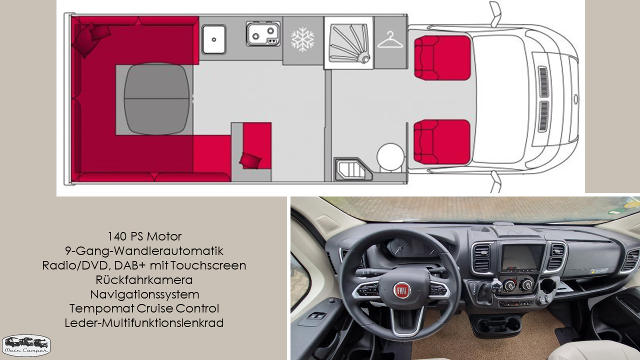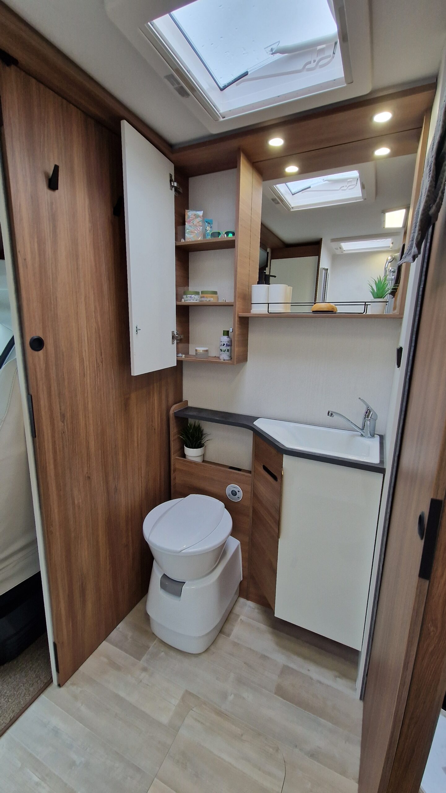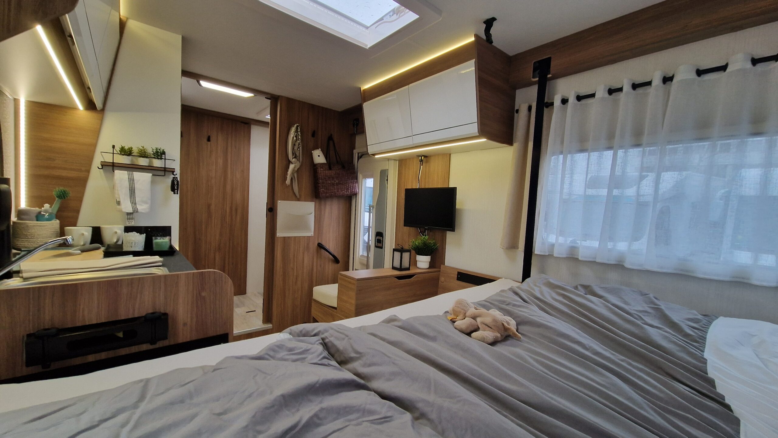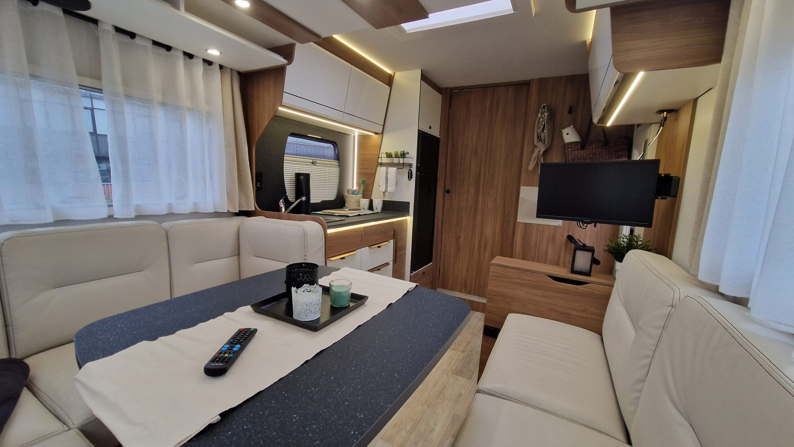 Über der Sitzgruppe befindet sich das große Hubbett, welches Sie entweder ganz herunterlassen können, wodurch ein Einstieg ohne Leiter bequem möglich ist. Falls Sie mit mehr als 2 Personen verreisen, kann selbstverständlich auch die Sitzgruppe zu einem weiteren Doppelbett unter dem Hubbett umgebaut werden.