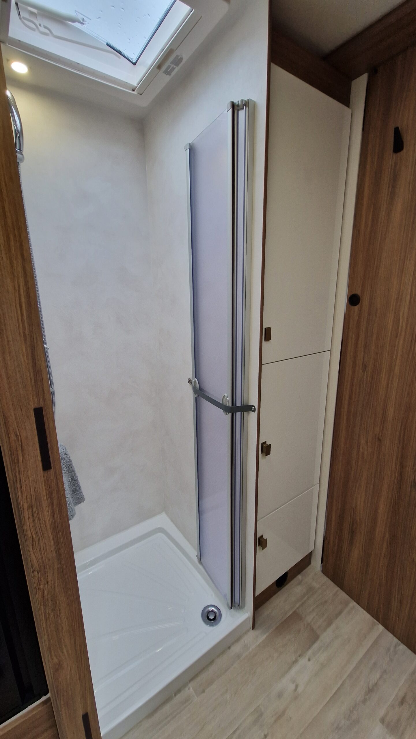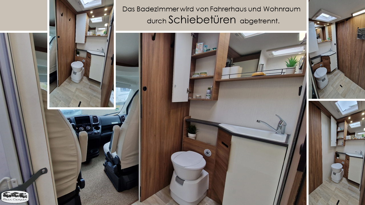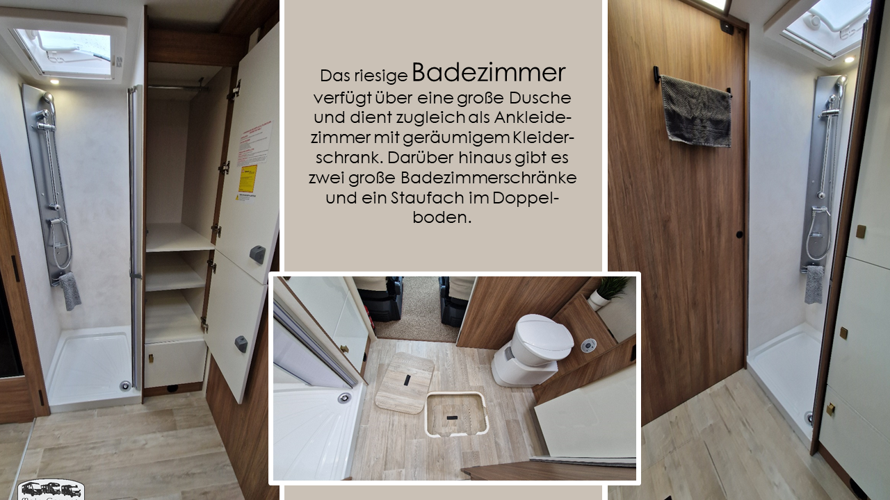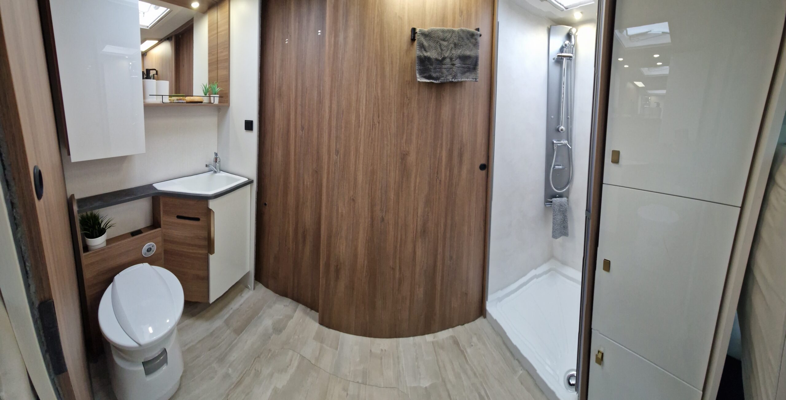 Das durch eine Schiebetür vollständig abgetrennte, riesige Raumbad dient gleichzeitig als Ankleidezimmer – und wenn Sie die weitere Schiebetür zum Fahrerhaus schließen, bekommen Sie endgültig nicht mehr mit, dass Sie sich eigentlich in einem Fahrzeug befinden.
